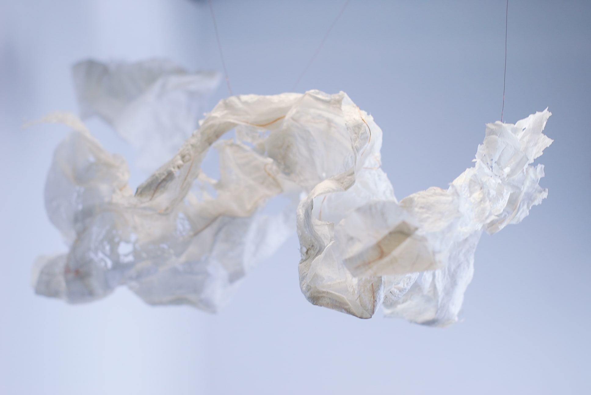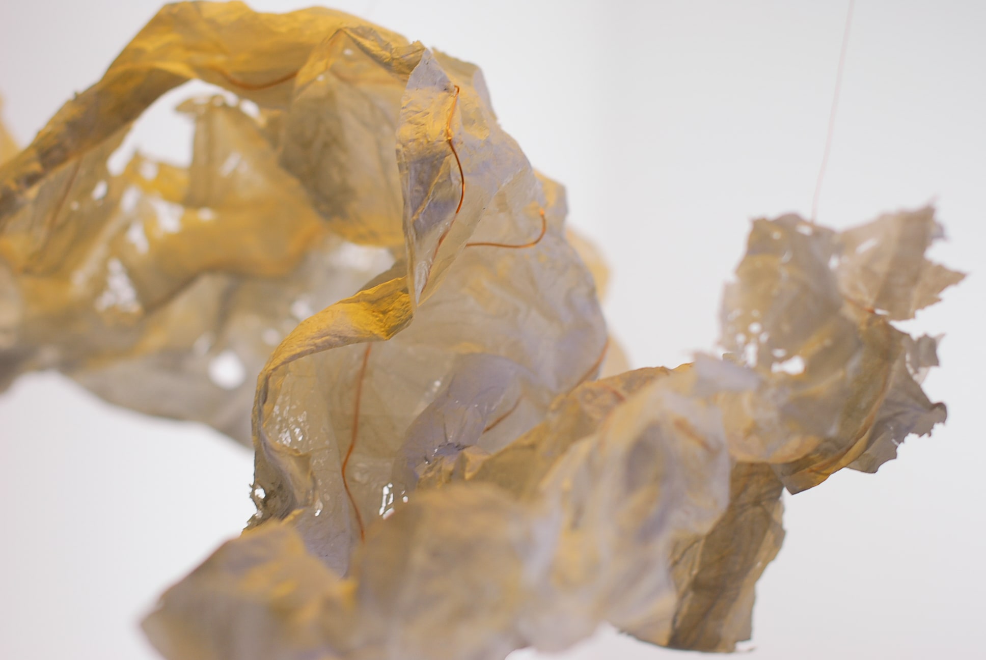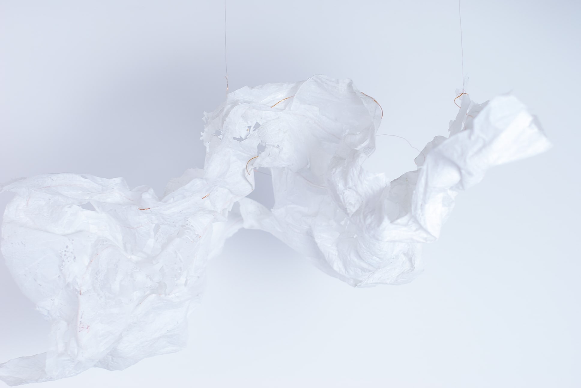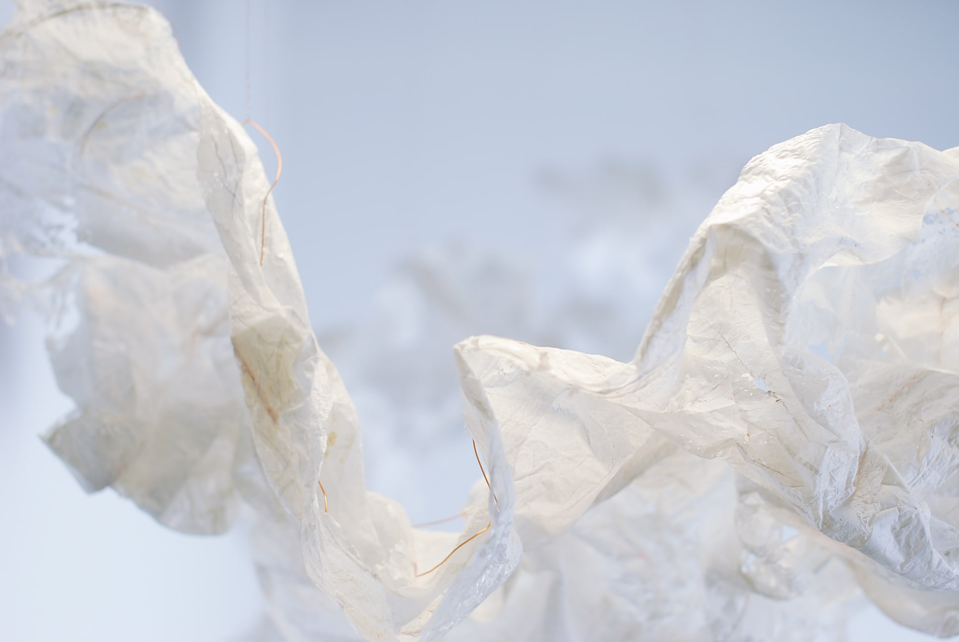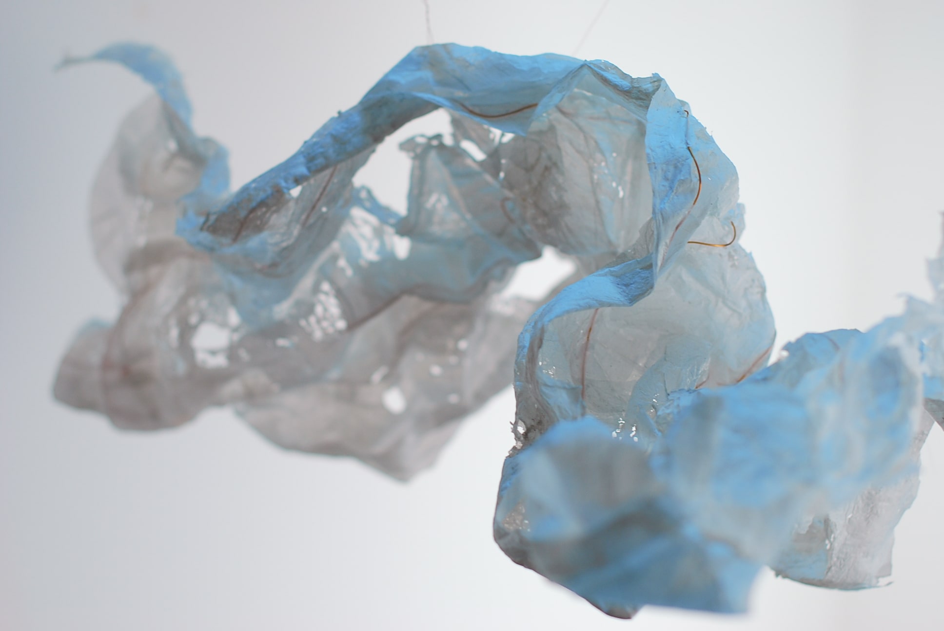De plasticzakjes die Betty gebruikt lijken net wolken als ze door de wind worden opgenomen en zweven door de lucht. Met het uitgangspunt ‘lampen als wolken’ zijn we gestart. Door de aard van het plastic moesten we het een vorm geven door er koperdraad in te verwerken. Door er met een lamp op te schijnen kwamen alle details van het strijken van plastic naar voren.