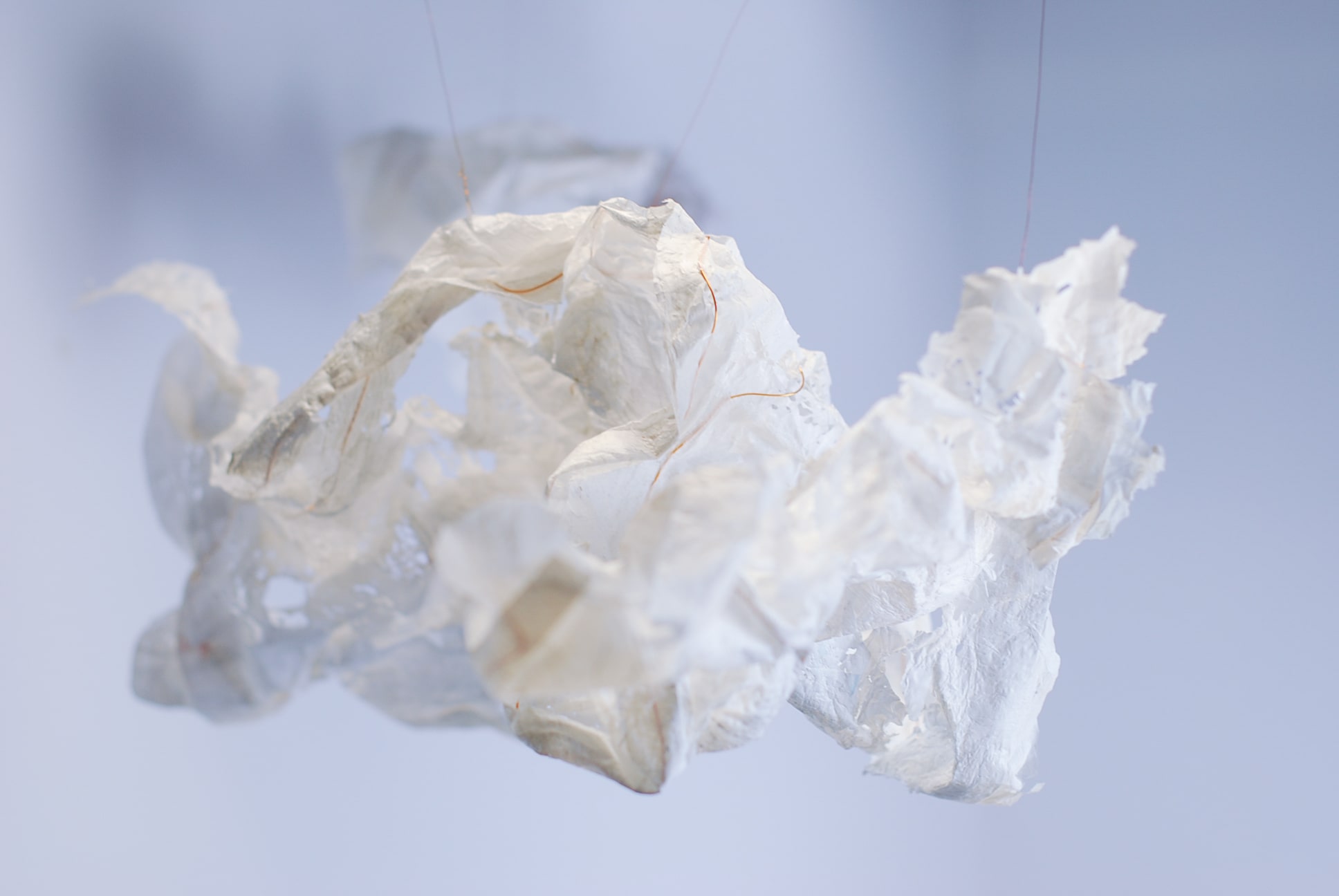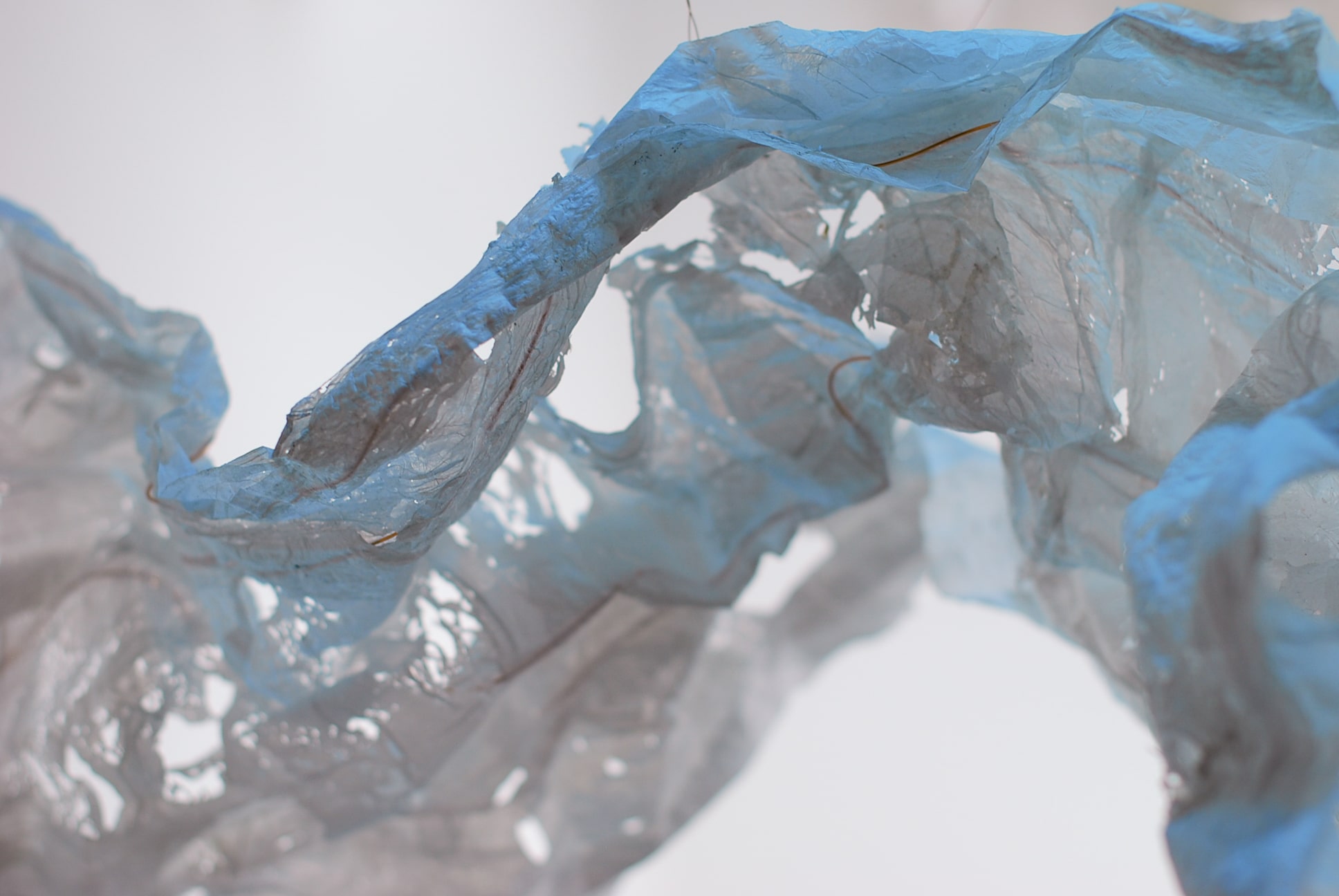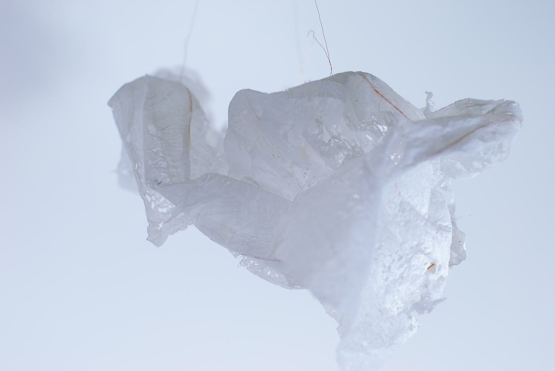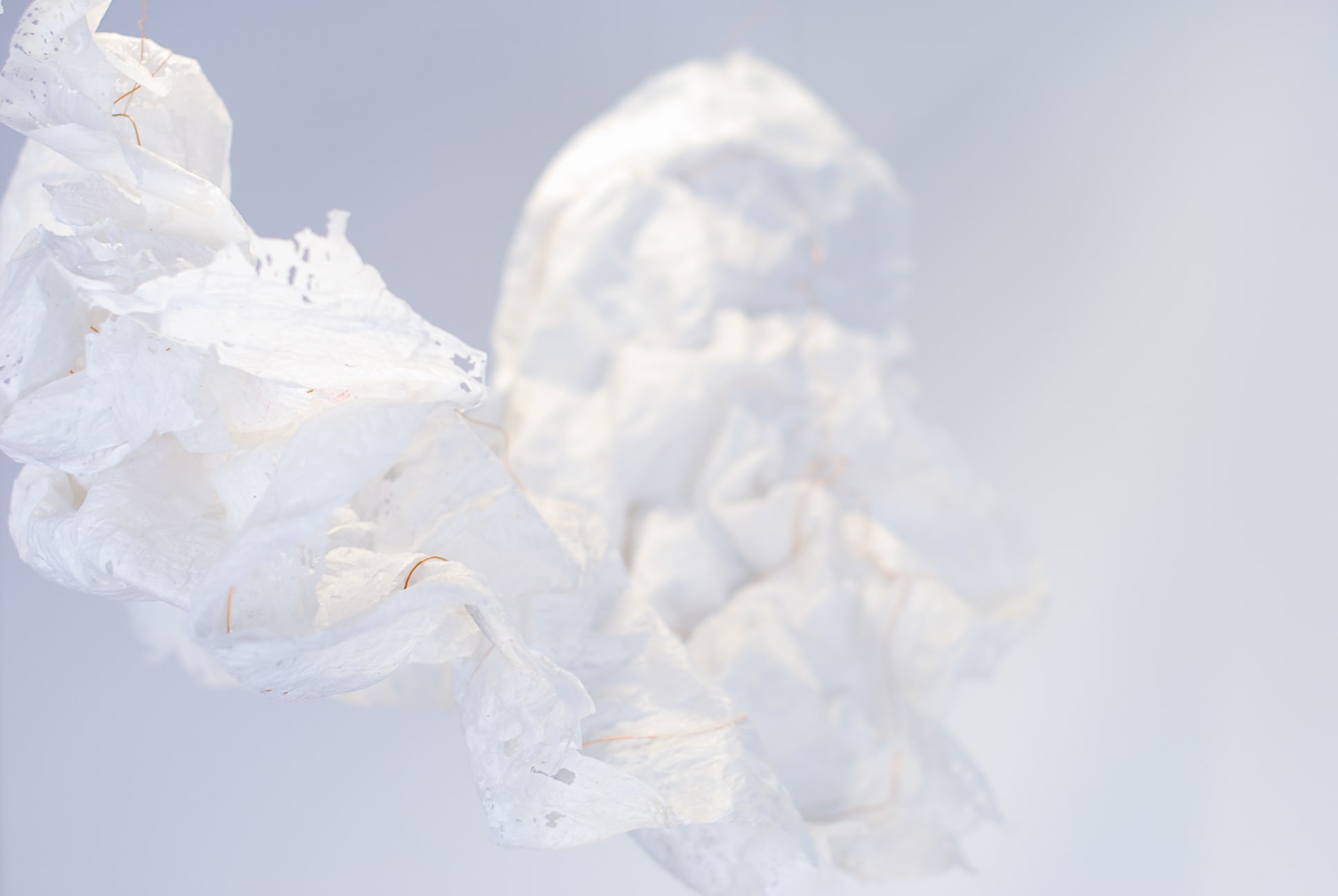 De plasticzakjes die Betty gebruikt lijken net wolken als ze door de wind worden opgenomen en zweven door de lucht. Met het uitgangspunt ‘lampen als wolken’ zijn we gestart. Door de aard van het plastic moesten we het een vorm geven door er koperdraad in te verwerken. Door er met een lamp op te schijnen kwamen alle details van het strijken van plastic naar voren.