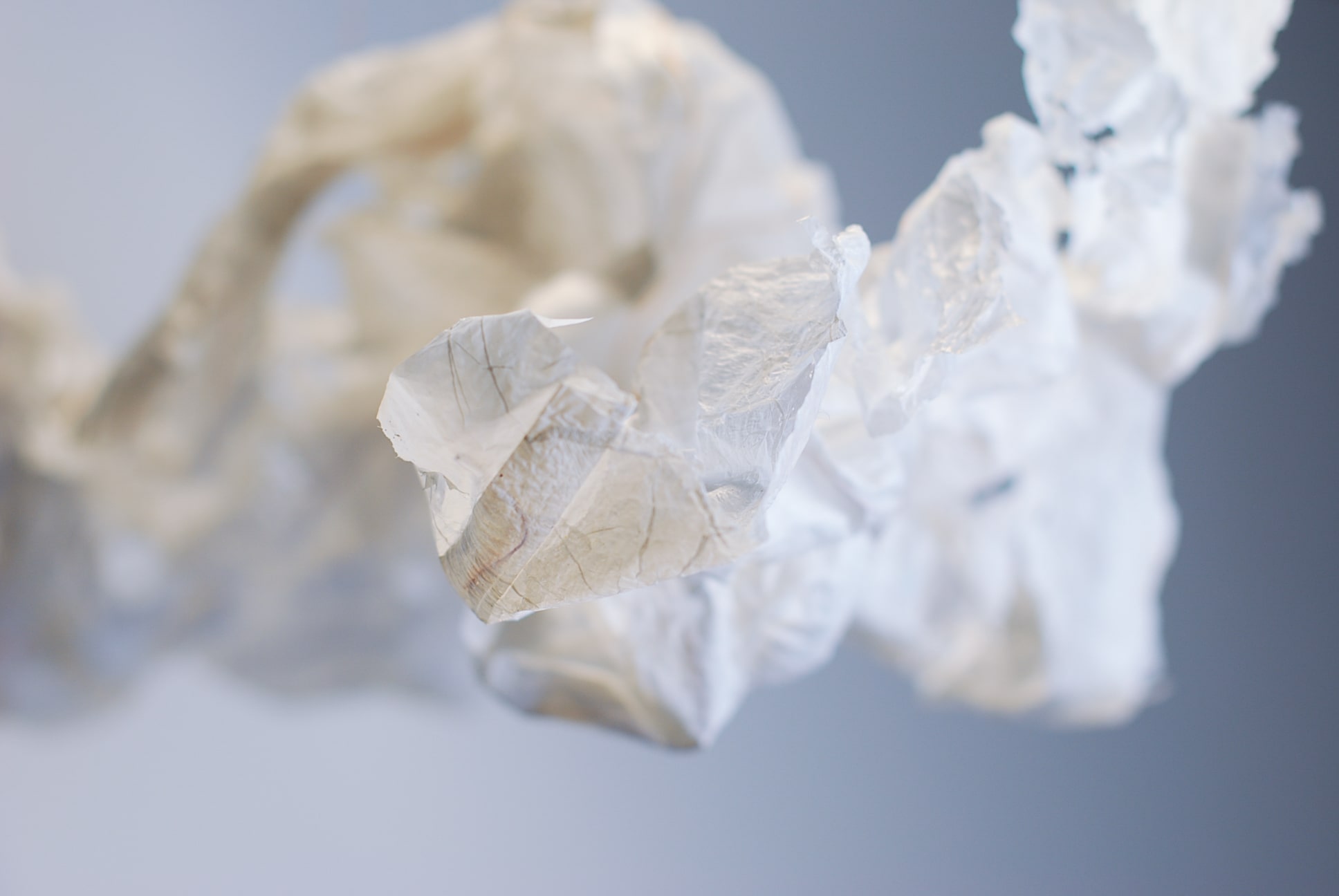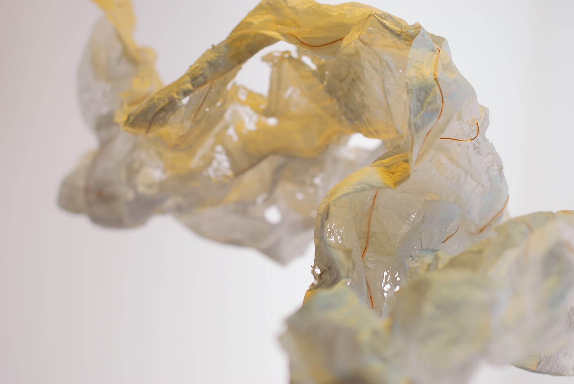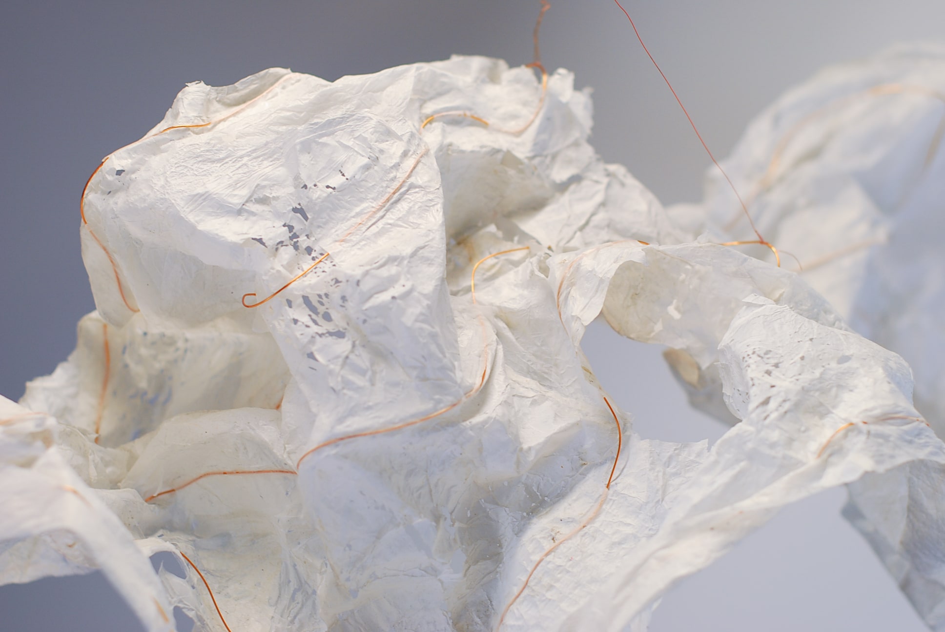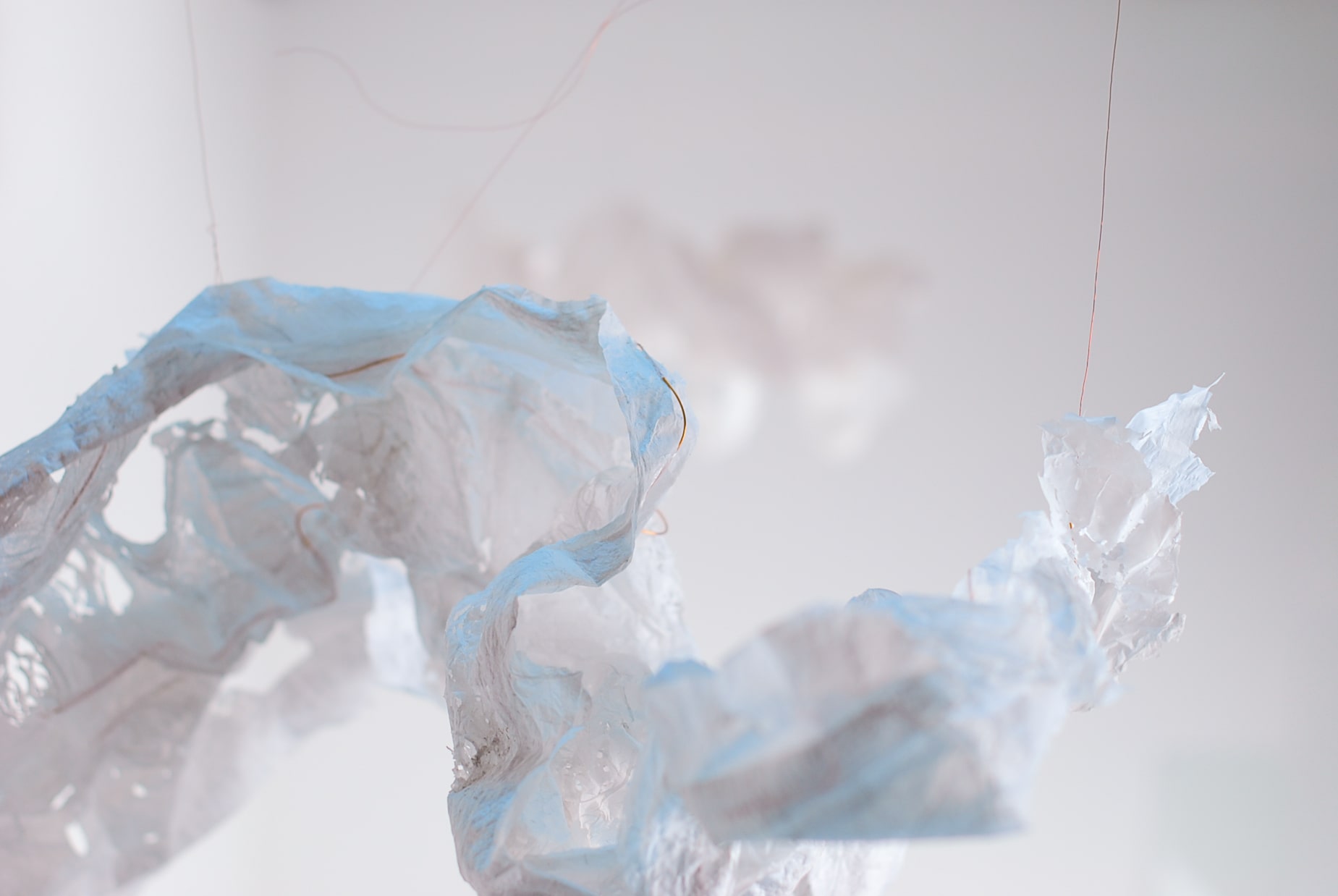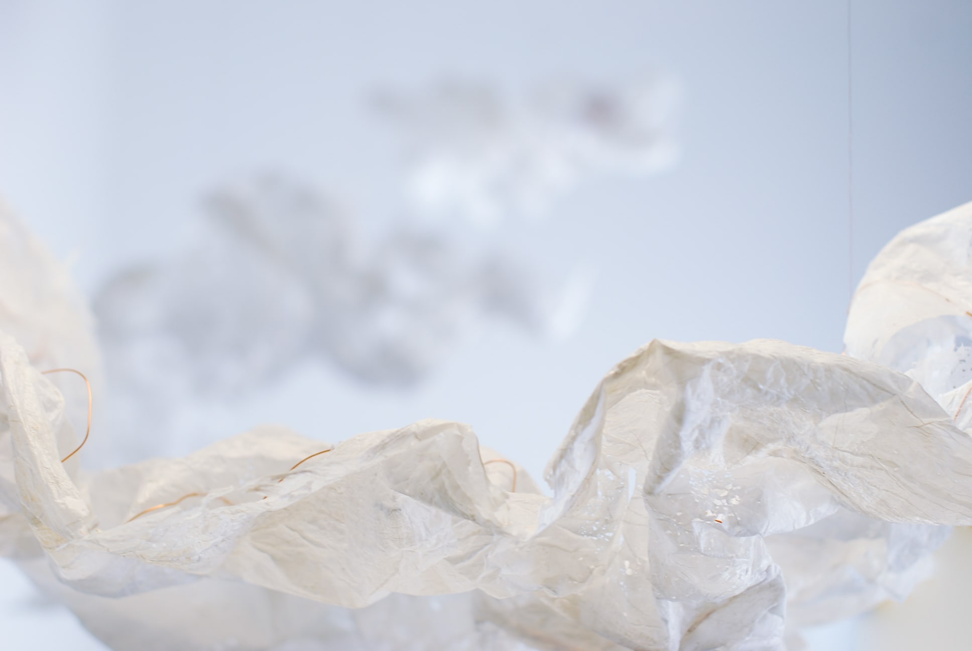 De plasticzakjes die Betty gebruikt lijken net wolken als ze door de wind worden opgenomen en zweven door de lucht. Met het uitgangspunt ‘lampen als wolken’ zijn we gestart. Door de aard van het plastic moesten we het een vorm geven door er koperdraad in te verwerken. Door er met een lamp op te schijnen kwamen alle details van het strijken van plastic naar voren.